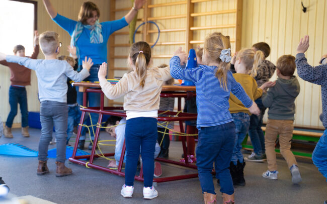 We geven 2 uur turnen per week. We hebben ervoor gekozen om 1 uur te turnen met hun klasgroep en 1 uur met hun leeftijdsgroep.